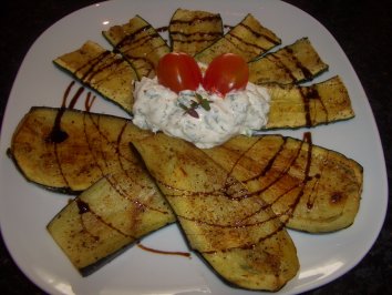 | Gebratene Zucchini & Aubergine mit 12 Kräuterquark u. Rosmarin - Balsamico Reduktion |