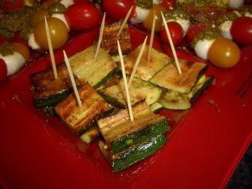 Die Zucchinistreifen in viereckig schneiden . Auf ein Stück Zucchini etwas Tomaten / Mozzarella / Pestomassen geben und ein weiteres Stück Zucchini geben und mit einem Zahnstocher fixieren und auf einer Platte anrichten .